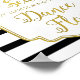 Veuillez trouver votre siège mais votre place est sur l'affiche de piste de danse pour mariage en motif rayures noires et blanches, cadre doré vintage glamour, fleurs vintage roses et pêche et texte de style lettrage à la main.