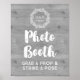 Panneau de photobooth de mariage affiche dans un motif de bois gris rustique avec illustration de couronne vintage et texte personnalisé de style écrit à la main et monogramme.