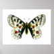 Parnassius apollo, un magnifique dessin vintage d'un papillon noir, blanc et rouge.