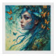 Une femme aux cheveux flottants et de couleur aqua est entourée de nombreux papillons colorés, ajoutant un sens de la fantaisie et de la magie à la scène. Son expression est sereine mais captivante, s'harmonisant avec les papillons vibrants qui la entourent.