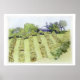 Illustration d'un paysage rural, de la campagne verdoyante, d'une ferme située sur une colline et d'arbres gravés dans le ciel. Le calme et la sérénité du pays. Egalement une belle carte, timbre, autocollant, aimant, sac, mousepad, t-shirt.