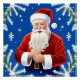 Père Noël joyeux dans une tenue rouge traditionnelle entouré d'un fond hivernal comportant des flocons de neige et des branches de pin. Parfait pour les fêtes et les créations sur le thème de Noël.