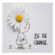 Une charmante illustration représente le dessin d'une petite fille aux joues roses, tenant une minuscule fleur et portant une marguerite blanche sur la tête, accompagnée d'une citation motivante. Le devis est modifiable.