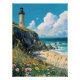 Un phare classique se tient ferme sur un affleurement rocheux, regardant au-dessus des vagues douces de l'océan. La plage s'étend à perte de vue, encadrée de hautes herbes et de fleurs sauvages, créant une scène côtière intemporelle. Un ciel bleu doux, parsemé de quelques nuages moelleux, vient compléter la beauté sereine du paysage. Ce paysage marin tranquille saisit la puissance tranquille de la côte et le calme qu'elle apporte.