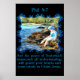 Phil 4:7 Et la paix de Dieu, qui transcende toute compréhension, gardera vos coeurs et vos esprits dans le Christ Jésus..Sur une affiche.Avec un bébé garçon pêchant dans la rivière avec un bâton comme une verge et un casquette bleu sur. Ses pieds dans l'eau et un cadre bleu clair.OEuvre réaliste créée à partir de peintures à l'huile.