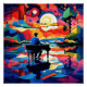 A.I.a créé une scène vibrante avec une personne jouant du piano contre un ciel étoilé fascinant au-dessus d'un cubiste coloré, paysage surréaliste comprend des collines roulantes, des arbres et un lac reflétant les corps célestes lumineux du ciel