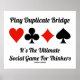 Faites faire à d'autres une double prise avec une dose d'attitude de pont dupliqué circonspect avec cette affiche avec les costumes de quatre cartes avec le dicton "Jouer le pont dupliqué C'est le jeu social ultime pour les penseurs". Pas besoin d'être un double joueur de pont ou un professeur de pont pour profiter!