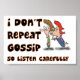 Un regard humoristique sur les commérages. Un dessin de deux dames. L'un chuchote dans les autres oreilles. Les mots Je ne répète pas les commérages Alors écoutez attentivement les entoure.