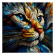 Un portrait de la tête d'un beau chat est présenté dans un style abstrait de vitrail. Les tons bleus, jaunes et turquoise se tissent dans cette composition artistique, capturant le charme du félin dans un décor fascinant et élégant.