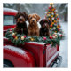 Capture the spirit of the season with this charming Portuguese Water Dog Christmas design! A classic vintage red pickup truck is nestled in a serene, snowy winter forest setting. Three adorable, fluffy Portuguese Water Dogs are the stars, sitting happily in the back surrounded by a beautiful Christmas wreath adorned with sparkling red and gold holiday ornaments and glowing lights. The scene is enhanced by gently falling snowflakes and a small, decorated Christmas tree in the background, making this a perfect representation of a cozy, joyful holiday season. This festive winter design is an ideal choice for dog lovers and anyone seeking unique holiday and winter cheer.