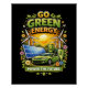 A bright eco-themed illustration promotes renewable energy with solar panels, wind turbines, and an electric car.