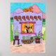 Ces quatre chats curieux sont assis dans la fenêtre encadrée de rose et de talavera et sur le toit d'une demeure en adobe de style taos, agréablement violet, dans le sud-ouest américain. Des cactus richement texturés et de succulents plantes dans des pots de talavera colorés mettent l'accent sur la maison, offrant un contraste bienvenu avec le sable du désert, où un lézard se trouve à proximité. Les montagnes roses et lavandes, ainsi que la verdure, illuminent l'arrière - plan sous un ciel bleu vif et sans nuages.