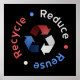 Poster noir avec un symbole de recyclage rouge, blanc et bleu entouré de "Reduce - Reuse - Recycle" en lettres rouges, blanches et bleues.