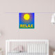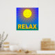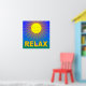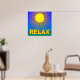 Une grande affiche colorée avec un grand soleil souriant et sous le mot "relax". Conçu pour apporter le calme et un sentiment chaleureux.