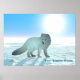 Blanc sur blanc. Une peinture numérique d'un renard arctique, Vulpes lagopus, sur la glace polaire. Le soleil est planté bas dans le ciel arctique bleu vif. Ne regardez pas au soleil car il peut nuire à vos yeux. Ajoutez votre propre texte. Le renard arctique est à l'aise dans le froid profond; il ne commence à frissonner que lorsque les températures tombent à environ -70 °C (-94 °F) en raison de sa fourrure dense et multicouche. D'autres adaptations à un climat froid comprennent la fourrure sur les semelles de ses pieds, de courtes oreilles et un museau court. Les renards de l'Arctique vivent dans des terriers, dans un blizzard, ils peuvent s'introduire dans la neige pour créer un abri. Le manteau du renard arctique, parfois gris-bleu, est un camouflage hivernal très efficace. Les teintes naturelles permettent à l'animal de se fondre dans l'environnement. Pendant la courte saison chaude, son manteau change de brun ou de gris, agissant de nouveau comme camouflage dans les roches de la toundra et plante. En hiver, lorsque les proies sont rares, les renards suivent la chasse aux ours polaires sur le banc de glace et se nourrissent de débris. En été, on mange rongeurs, oiseaux, oeufs et même poissons. Ils se nourrissent également de baies et d'algues. Les renards de l'Arctique ont une ouïe extrêmement attentive, aidés par leurs larges oreilles orientées vers l'avant, qui leur permettent de localiser la position précise de leur proie sous la neige. S'il entend quelque chose se déplaçant sous la neige, il saute dans l'air et rebondit, frappant à travers la neige pour attraper sa proie. L'aire de répartition du renard arctique est circumpolaire; on en trouve dans tout le nord. Seul mammifère terrestre originaire d'Islande, il est arrivé en marchant sur la glace à la fin de la dernière ère glaciaire.