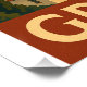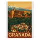 Affiche de voyage rétro de Grenade, Espagne, présentant le majestueux palais de l'Alhambra sur une colline avec les montagnes de la Sierra Nevada dans l'arrière - plan. Le palais est baigné de lumière dorée chaude en fin d'après-midi, avec des arcades et des tours mauresques détaillées visibles.