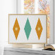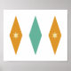 Cette affiche moderne du milieu du siècle présente 3 grands diamants avec 2 étoiles au centre, dans un mélange de couleurs bleu turquoise, orange et crème. Cela ferait un ajout amusant à vos murs !