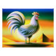Illustration stylisée et colorée d'un coq debout sur une corniche avec un coucher de soleil éclatant dans l'arrière - plan, avec des formes géométriques et un paysage surréaliste.