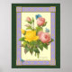 Reproduction ancienne de fleurs roses et jaunes de rose, oeuvre botanique du célèbre artiste Pierre Redoute aux papillons bleus. Les fleurs sont listées sur l'oeuvre ; les roses jaunes persanes (rosa Lutea) et les roses de thé rose (rosa indica). Cadre avec des éléments de manuscrits anciens.