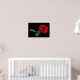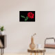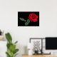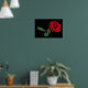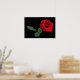 Cette affiche élégante présente une magnifique rose rouge écarlate avec trois feuilles verts contre un arrière - plan noir.