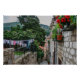 Peinture de rue étroite avec bâtiments en pierre, fleurs, laverie pendante et escaliers dans la vieille ville, Dubrovnik. Blanchisserie à la façade typiquement croate. Rue étroite avec bâtiments de sable blanc.