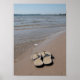 The Natural Sandals on the Beach Poster Print présente une photo de la nature de deux tongs en cuir sur une plage de sable le long du lac Michigan par une chaude journée d'été. En regardant, on a l'impression d'être en vacances !