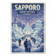 Travel poster featuring the Sapporo Snow Festival in Japan, illustrated in a bold retro winter-travel style. Massive snow and ice sculptures lining Odori Park, glowing softly under winter lights, with visitors walking through the snowy avenue. Snowflakes falling gently, city skyline and winter trees in the background. Cool retro color palette: icy blue, white, pale cyan, soft lavender, deep navy. Clean graphic shapes, subtle grain texture. Bold vintage typography: “SAPPORO SNOW FESTIVAL – JAPAN”. Vertical 2:3 layout, crisp composition, high-resolution for print.