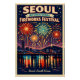 Travel poster featuring the Seoul International Fireworks Festival in a vibrant retro travel-poster style. Nighttime cityscape of Seoul with the Han River in the foreground, silhouettes of bridges and the skyline, and spectacular colorful fireworks bursting across the sky. Reflections of fireworks shimmering on the river surface. Retro color palette: deep navy blue, midnight purple, bright red, gold, turquoise, and cream highlights. Clean graphic shapes, strong contrast, subtle grain texture. Bold vintage typography: “SEOUL INTERNATIONAL FIREWORKS FESTIVAL” with smaller text “Seoul, South Korea”. Vertical 2:3 layout, high-resolution, print-ready.
