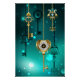 Or, clés antiques avec engrenages et cadrans accrochés sur chaînes dorées sur arrière - plan vert lumineux.