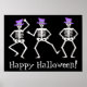 Ces squelettes dansants font une grande affiche d'Halloween. Amusant à accrocher sur la porte ou les murs pour les fêtes ou les tours ou les traiteurs. Trois squelettes dansent sur un arrière - plan noir avec les mots personnalisables "Happy Halloween". Vous pouvez changer à votre propre dicton ou nom. L'art original peint à la main présente des squelettes dansants avec chapeau dessus violet sur leurs crânes et est dans les couleurs noir et blanc avec violet. Recherchez mes autres produits avec cet art pour les produits goulish pour Halloween, y compris les invitations, cartes de voeux, tee - shirt, coques électroniques et plus. Entièrement personnalisable pour la personnalisation. L'art original est de Phyllis Dobbs qui vous souhaite une Halloween joyeuse et lugubre.