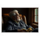 Portrait photographique d'un vieil homme aux cheveux blancs et à la barbe, portant des lunettes, assis seul dans un fauteuil en cuir marron profond. Il regarde avec nostalgie une fenêtre proche, éclairée par une lumière naturelle douce, avec des poussières visibles dans l'air. La chambre traditionnelle et cosy environnante est faiblement éclairée, créant une atmosphère calme, contemplative et mélancolique. Un livre fermé se trouve à proximité, mettant l'accent sur la solitude et l'immobilité réfléchissante. L'accent est mis sur son expression réfléchie et sur la sérénité qui l'entoure.