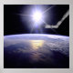 Vue de l'effecteur RMS (Remote Manipulator System) au-dessus d'un membre de la Terre avec un motif de démarrage solaire derrière lui.