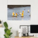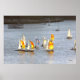 This photographic image of small sailboats is unusual in that they are gathered closely and also sailing with colorful spinnakers. This photo shows the sails glowing near sunset.