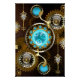 Turquoise lenses with antique watch with brass gears and golden keys on rusty, brown background. Steampunk style.