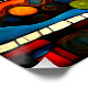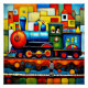 A.I.Assistance print d'un enfant au premier plan observe une scène vibrante et colorée avec un train lunatique avec des enfants qui regardent depuis les fenêtres sur un fond de bâtiments géométriques.