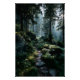 Golden sunlight pours through towering evergreen canopies, illuminating a winding stone path blanketed in soft moss and scattered rocks. Mist drifts gently among ferns and tree trunks, diffusing the warm rays into a dreamy, almost sacred glow. The composition radiates profound calm, timeless solitude, gentle renewal, the quiet magic of untouched wilderness, and the call to step deeper into nature’s embrace—perfect for meditation rooms, bedrooms, home offices, therapy spaces, nature-inspired living areas, or as soul-soothing gifts for hikers, mindfulness seekers, forest lovers, or anyone craving peace, grounding, daily inspiration, or reminders of inner stillness.