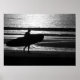 Silhouette d'un homme portant sa planche de surf vers l'océan avec le soleil brillant hors de l'eau.