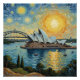 This vibrant, heavily textured painting captures the Sydney Opera House and Harbor Bridge under a dramatically swirling, enormous sun in the distinct style of Van Gogh.