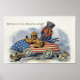N'aie pas peur, oncle. On y arrivera bien ! Le président Teddy Roosevelt est au volant d'une voiture de course patriotique et l'oncle Sam est en route. Ils ont envoyé un poulet et un chien courir pour leur vie dans cette carte postale vintage de 1907.