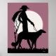 Une silhouette design art déco de femme et de chien dressée contre une lune blanche éclatante, arrière - plan rose poussiéreux à silhouette noire.