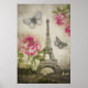 Affiche française chic à l'art vintage parisien avec une vieille illustration de la Tour Eiffel, pivoines roses et papillons. Vous pouvez personnaliser ce poster avec du texte personnalisé.