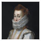 Une femme parée d'une robe élisabéthaine somptueuse regarde dehors, son ruff est exagéré pour exprimer l'effet que la mode a sur les jeunes filles. La robe complexe suggère un statut élevé. Ses cheveux roux sont coiffés avec élégance, complétant les tissus riches et les détails ornementaux de sa tenue.