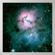 Photographie spatiale - la Nébuleuse Trifid en rose contre un champ d'étoiles.