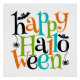 Un texte typographique moderne et coloré "happy halloween" en noir, orange, bleu et vert avec chauves-souris et araignées. Fantastique pour les fêtes et célébrations d'Halloween.