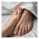 Le pied d'une femme et le pied d'un homme se touchent sur un lit, partiellement recouvert de draps blancs et moelleux