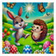 Un lapin et un hérisson heureux, danser Pâques dans le jardin du printemps, vous vous réjouissez des oeufs de Pâques que vous allez bientôt donner ! Une illustration numérique de la fête de Pâques