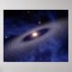 Un lointain système solaire où planètes et astéroïdes entourent deux soleils animés.