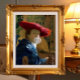 Une femme portant un casquette rouge vif soufflant une gomme à bulles, ajoutant une touche ludique à la scène. L'arrière - plan est décoré dans un style orné et détaillé, en contraste avec l'élément fantaisiste au premier plan.