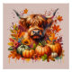 Vache de Highland dans un patch citrouille avec des feuilles de fleurs et d'automne.