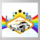 Design vectoriel amusant d'une vieille voiture vintage, sur l'arrière - plan de la ville animée Las Vegas, avec des bâtiments modernes. Lumières dorées, grandes étoiles, rayures vives et colorées, rehaussent la lueur de la ville qui ne dort jamais, Las Vegas !